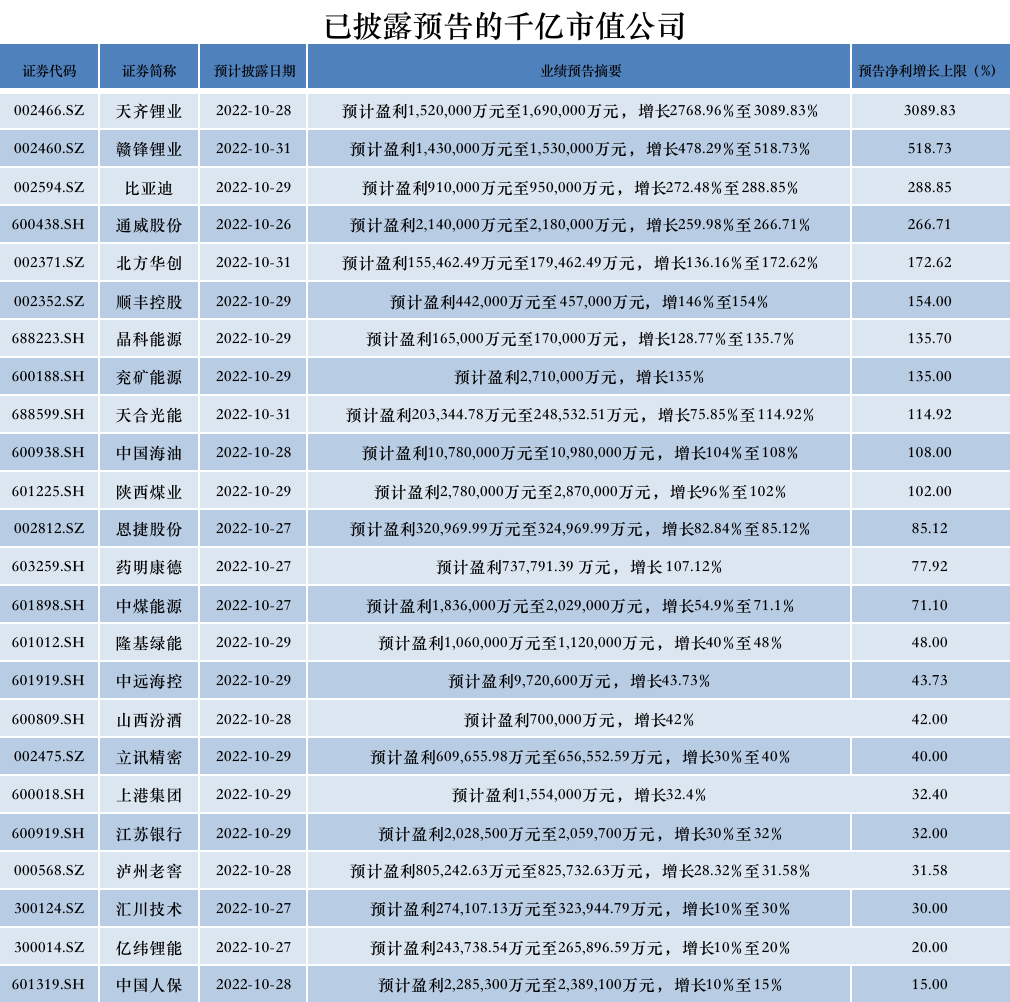 120余家千亿市值公司三季报来袭,天齐锂业净利预增超30倍