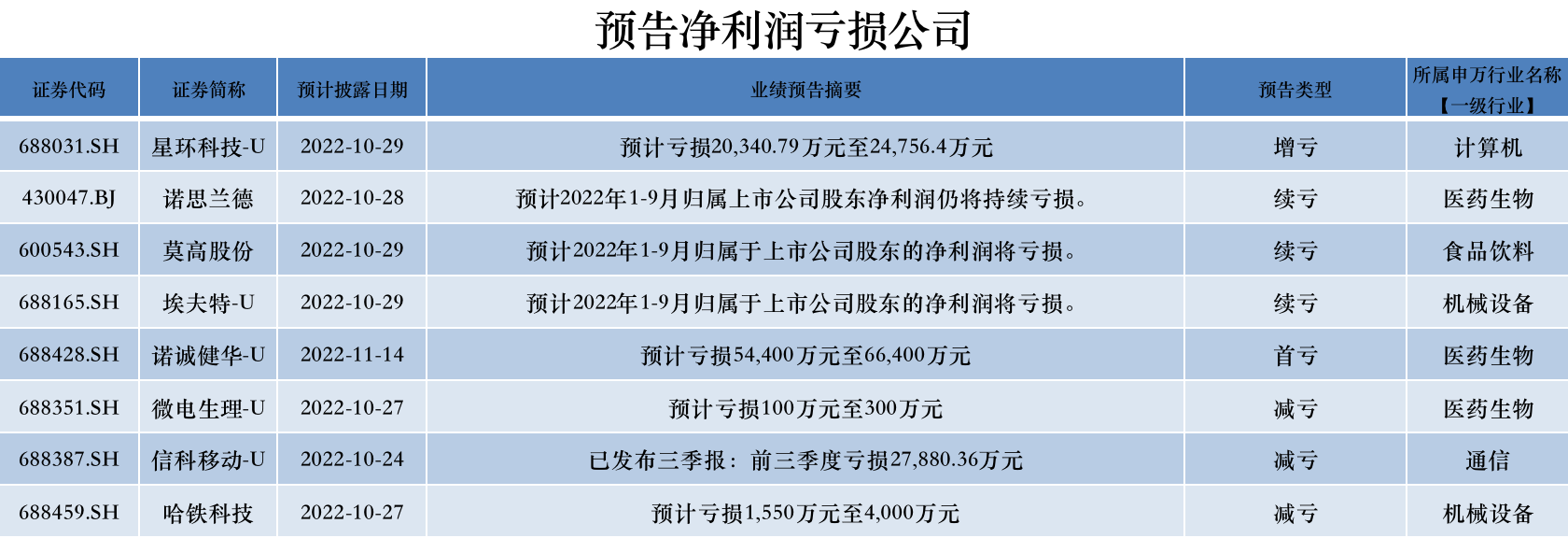 至少8家公司将披露亏损的三季报,3家来自医药生物板块、2家来自机械设备板块,其余计算机、食品饮料、通信板块各1家。