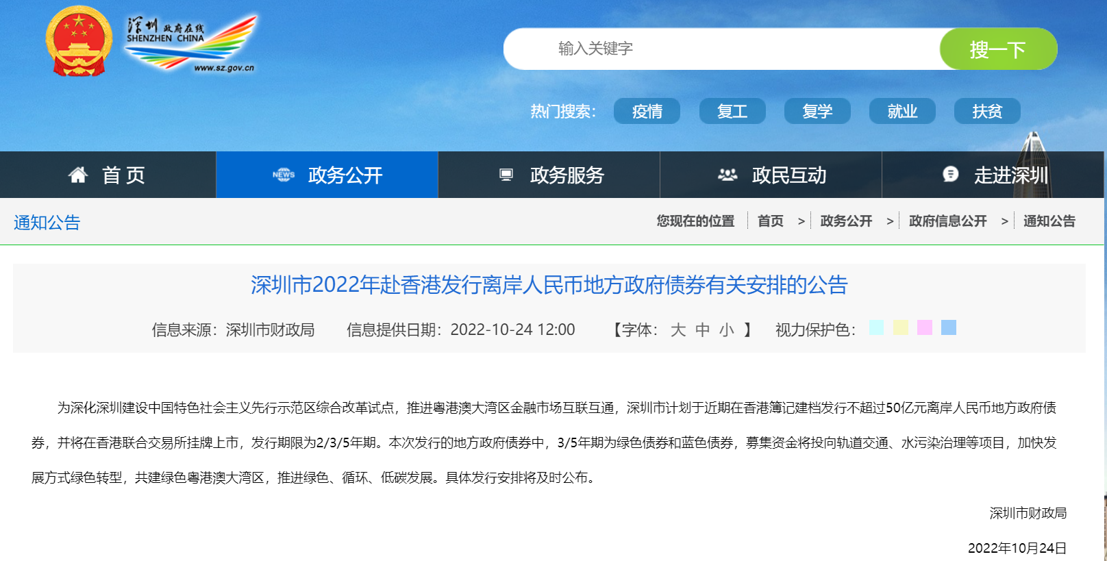深圳市政府网站10月24日消息,深圳市财政局公告,为深化深圳建设中国特色社会主义先行示范区综合改革试点,推进粤港澳大湾区金融市场互联互通,深圳市计划于近期在香港簿记建档发行不超过50亿元离岸人民币地方政府债券,并将在香港联合交易所挂牌上市,发行期限为2/3/5年期。本次发行的地方政府债券中,3/5年期为绿色债券和蓝色债券,募集资金将投向轨道交通、水污染治理等项目,加快发展方式绿色转型,共建绿色粤港澳大湾区,推进绿色、循环、低碳发展。具体发行安排将及时公布。