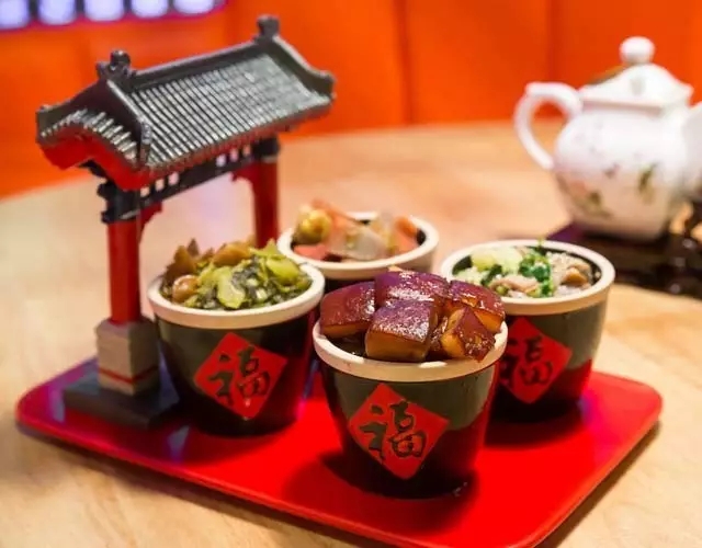 怀旧菜的器皿分为两种,一种是回归传统本身的。例如红烧肉的器皿是印有福字的小瓦缸;萝卜炖牛腩用的是印有大公鸡的大腕。
