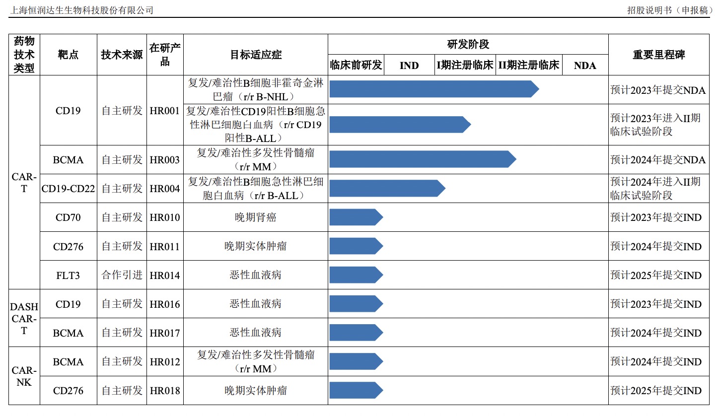 招股书显示,恒润达生主要聚焦恶性血液病和实体肿瘤等治疗领域,其管线包括CAR-T、CAR-NK等技术在内的已建立包含10个产品的11个研发管线,涉及2种细胞类型产品体系。其中,CAR-T HR001治疗复发/难治性B细胞非霍奇金淋巴瘤(r/r B-NHL)适应症被纳入国家药监局药审中心(CDE)“优先审评审批程序”,已处于II期注册临床试验阶段(确证性临床试验),预计于2023年提交上市申请;CAR-T HR003治疗复发/难治性多发性骨髓瘤(r/r MM)适应症被CDE纳入“突破性治疗药物程序”,已处于II期注册临床试验阶段(确证性临床试验)。