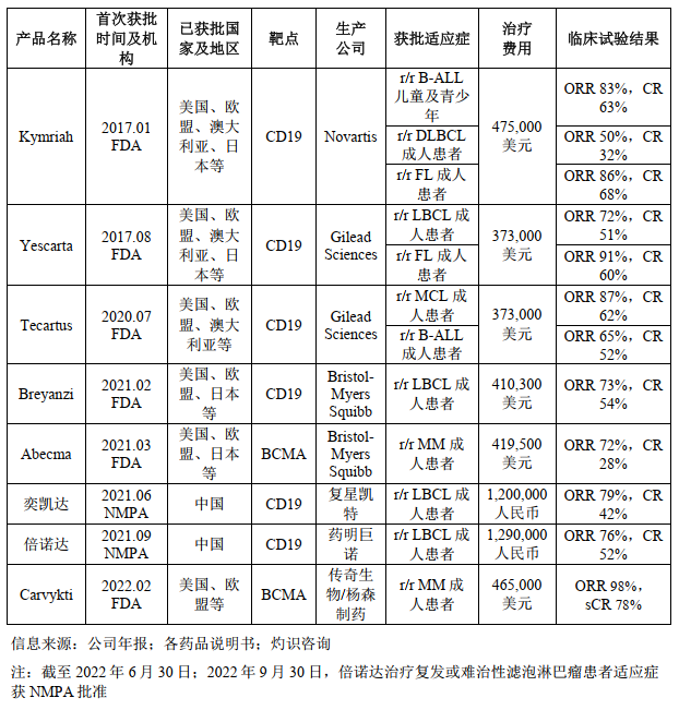 其中5款以B细胞上CD19为靶标,2款以B细胞成熟抗原(BCMA)为靶标,涉及的适应症为滤泡中心淋巴瘤、弥漫性大B-细胞淋巴瘤、多发性骨髓瘤和急性淋巴细胞白血病等恶性血液肿瘤。2021年上述前6款产品的销售业绩分别为5.87亿美元、6.95亿美元、1.76亿美元、0.87亿美元、1.64亿美元、500万美元。