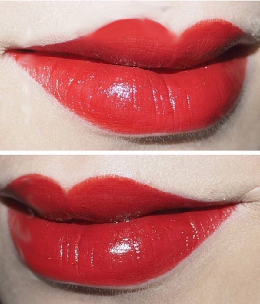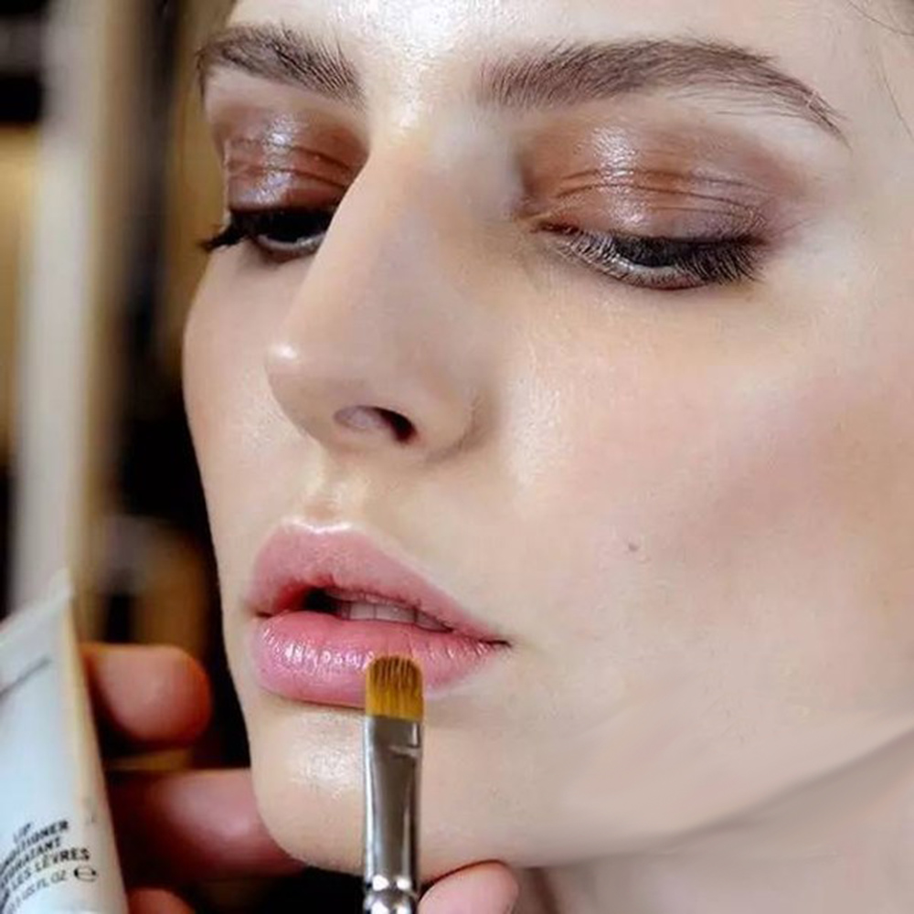 最后一步,将浅色唇蜜或是液态的唇膏用刷子均匀覆盖一层在口红上,“光疗唇”就完成啦。