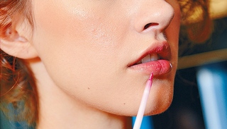 光疗唇也能在手指控制间玩出新花样来,口红沿着唇缝向外扩散,注意不要填满,在这个状态下再覆盖一层唇蜜,带着渐变的“光疗唇”就滋润且诱惑别致的完成了。