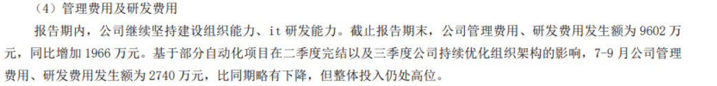 截止报告期末,公司管理费用、研发费用发生额为9602万元,同比增加 1966 万元。