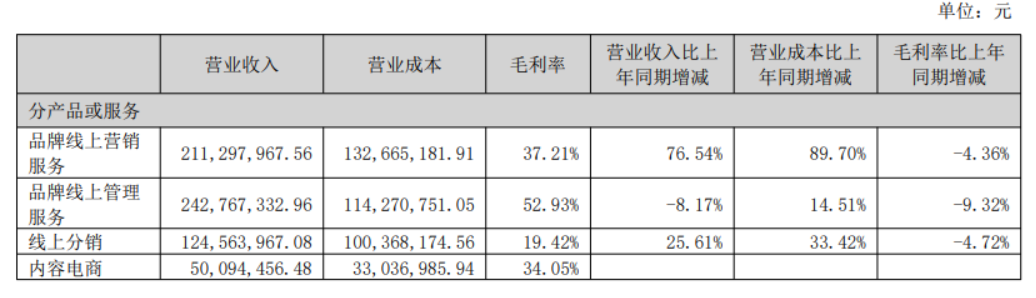 三季度报中,壹网壹创虽未具体公布线上营销服务、线上管理服务、线上分销的具体内容,但也表示,“公司营业收入较同期增长,主要系品牌线上营销服务、线上分销的新增客户收入增长贡献以及如内容电商这样新增业务类型的收入增长贡献所致。”