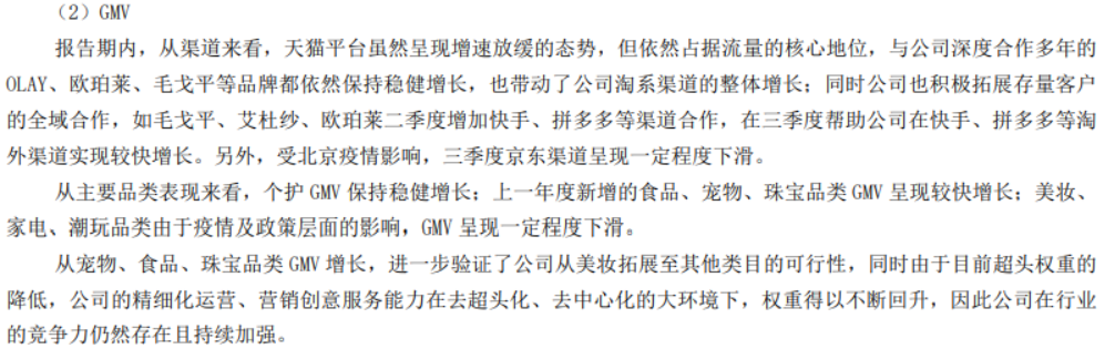 据第三季度报告显示,个护GMV保持稳健增长;上一年度新增的食品、宠物、珠宝品类GMV呈现较快增长;美妆、家电、潮玩品类由于疫情及政策层面的影响,GMV呈现一定程度下滑。