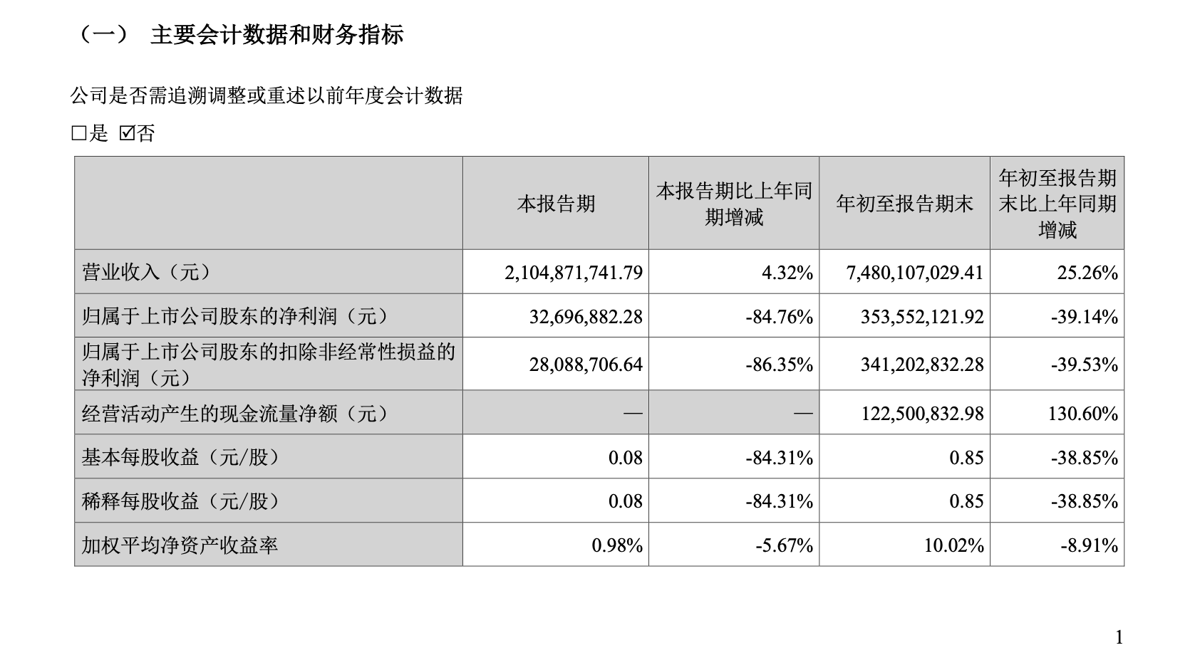 10月25日晚间,华致酒行发布《2022年第三季度报告》显示,今年前三季度实现营业收入74.8亿元,同比提升25.26%;归属于上市公司股东的净利润为3.54亿元,同比下降39.14%;经营活动产生的现金流量净额为1.23亿元,同比增长130.6%。其中,第三季度实现营业收入21.05亿元,同比增长4.32%;归属于上市公司股东的净利润0.33亿元,同比下降84.76%。