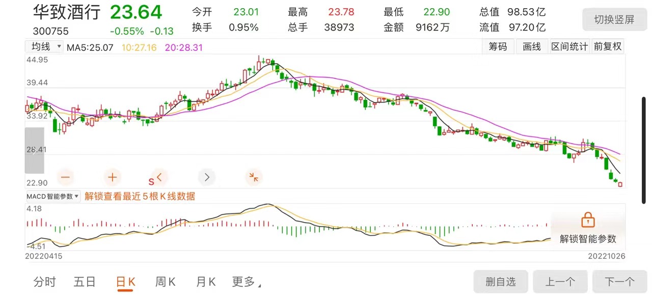 界面新闻整理华致酒行今年以来资本市场表现来看,截至目前,年内股价峰值出现在1月4日达48.14元/股。单从10月资本市场表现来看,10月第一个交易日华致酒行股价为28.39元/股,截至今日早盘股价已跌至23.64元/股。