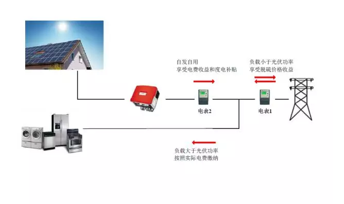 此时,光伏系统电量通过电表2计量,电量除了满足家庭使用,多余的电量还会通过电表1上传给电网。