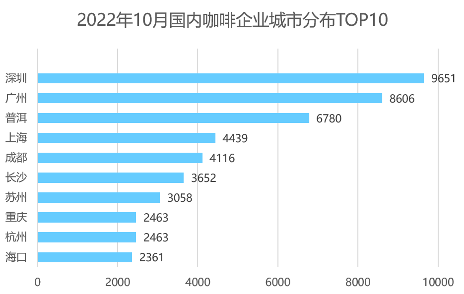 根据相关数据,截至10月,我国现存咖啡相关企业16.8万家。城市分布上,深圳现存9651家相关企业,位列第一;其次是广州,现存8606家。