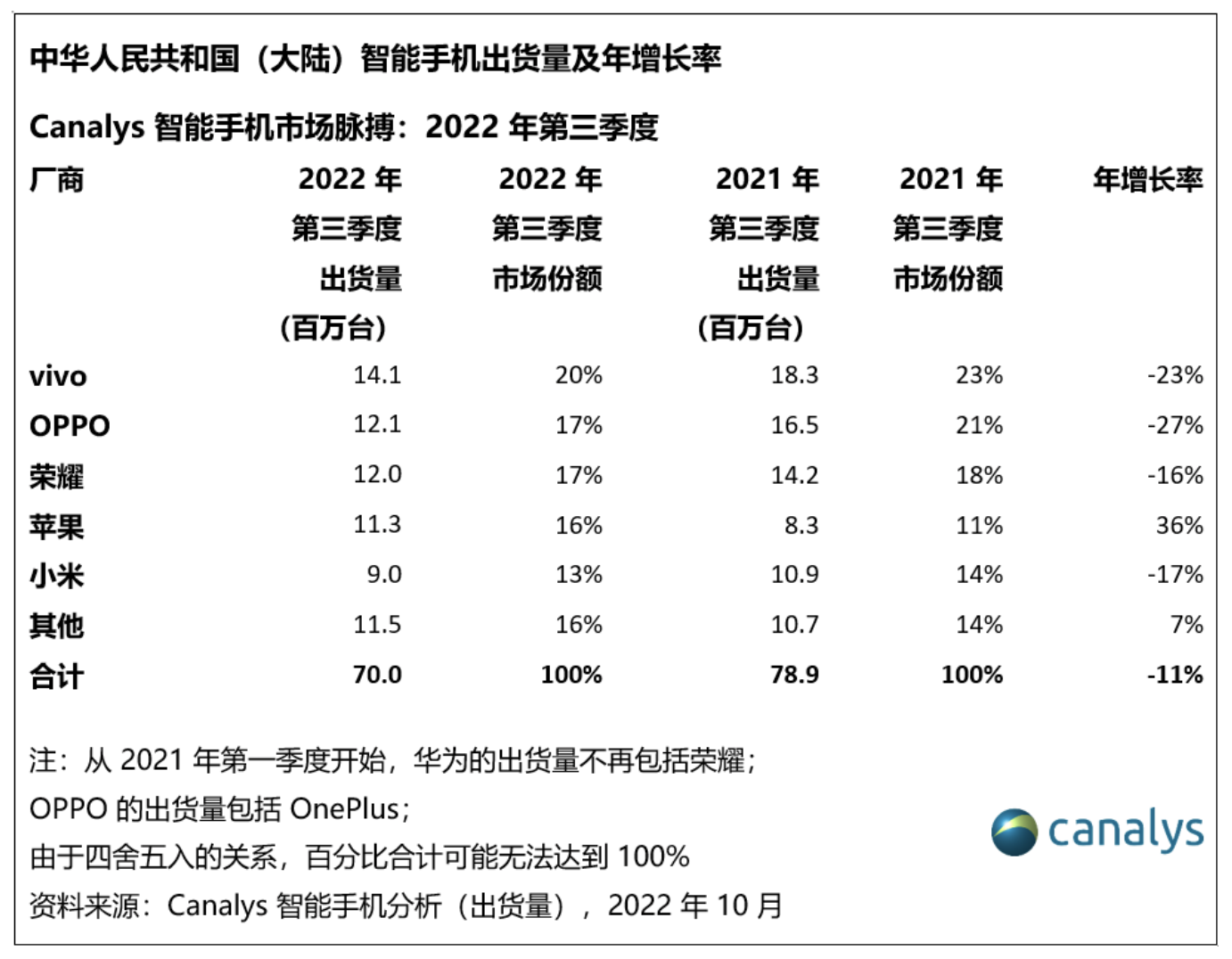 10月27日,第三方市场机构Canalys发布了2022年第三季度中国大陆智能手机市场报告。报告显示,三季度中国大陆智能手机出货量达7000万台,相比二季度有所改善,但市场仍在低位徘徊,同比下跌11%。