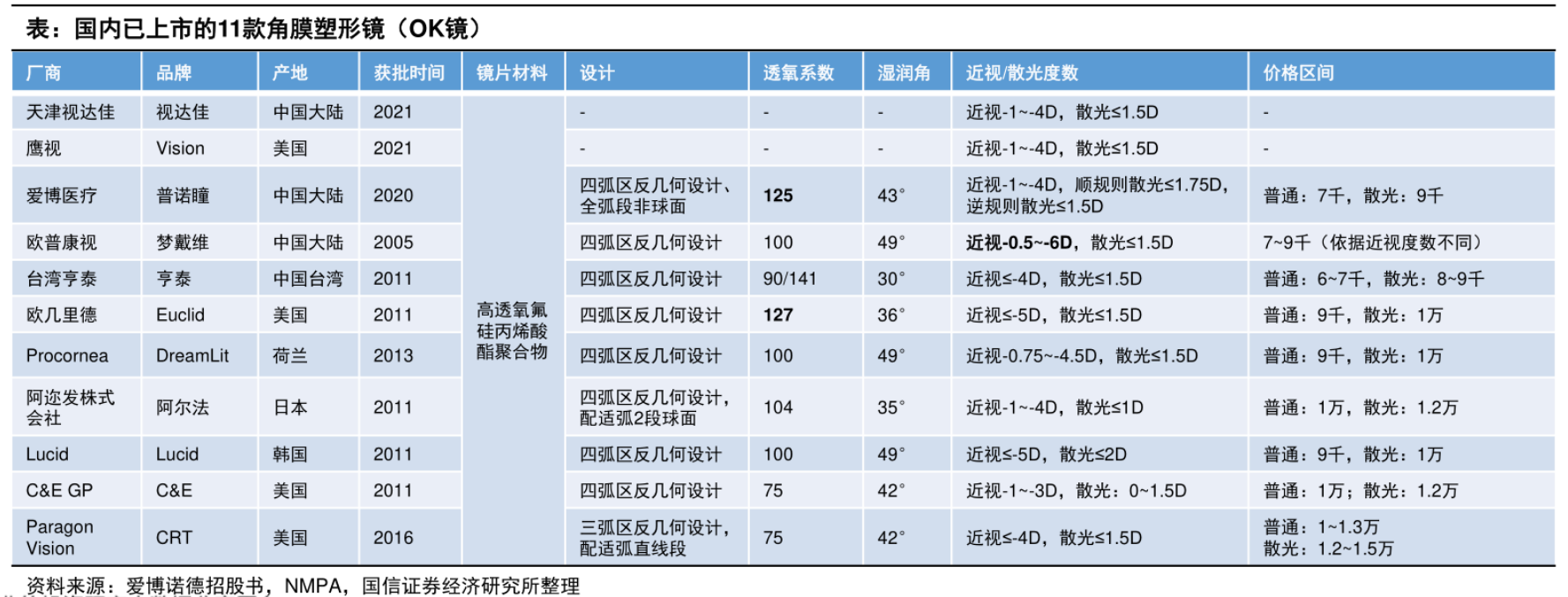 据国信证券研报显示,目前在国内共有11款OK镜产品上市。涉及的上市公司包括爱博医疗、欧普康视和昊海生科。此外,还有一家未上市的国产公司天津视达佳。其余7款均是境外品牌。