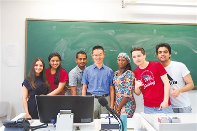 洪桐怀(左四)在北京语言大学的教室中和来华留学生合影。