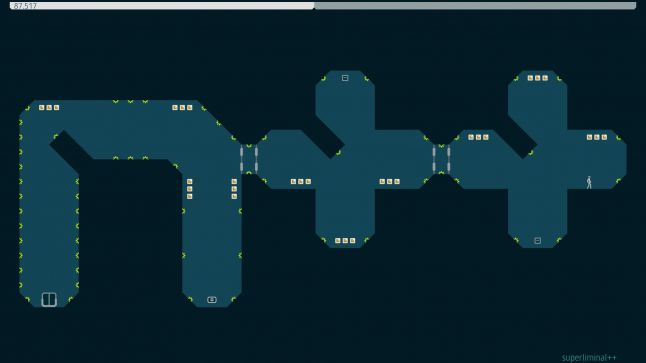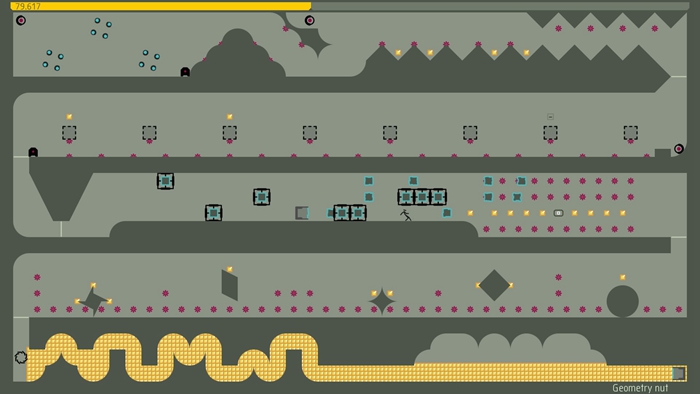 先来认识一下这个系列的游戏。《N》、《N+》以及《N++》是一系列以动作为基础的平台游戏。和大多数平台游戏不一样的是,该系列的基础操作“跑”和“跳”更具表现力、挑战性,并且一点也不繁琐:玩家操控下的忍者具有很多惯性,要求很细微地学习如何控制——这点和《Trails》这些驾驶游戏有点像。另外,你可以不断调整你的动力,这一点和传统的平台游戏不太一样。