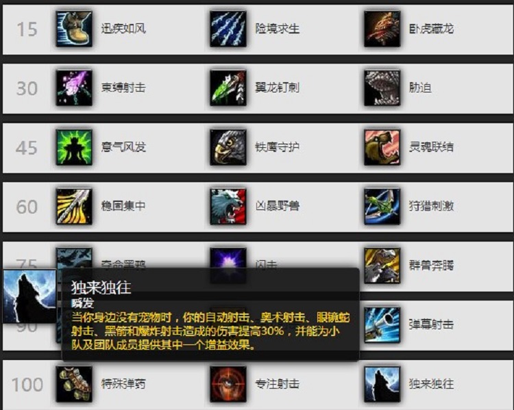 《德拉诺之王》更新之后,射击猎人天赋最后一栏出现的“独来独往”天赋,让人眼前一亮。猎人放弃了从诞生之初一直陪伴他的宠物,真正的成为了一名“独行侠”。这也许是暴雪想要给猎人这个职业带来更多多元化的变化,而非一成不变的带着宠物天荒地老。