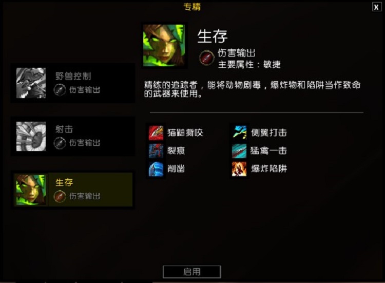 玩家们选择熟悉的生存专精后,会发现猎人变成了完全不熟悉的近战猎人。五个主要的攻击手段全部变为近战攻击,不过依然能够召唤宠物。以后经常出现场面可能就是猎人们带着他们的宠物一起冲锋陷阵了。