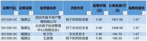 海源达(831329)去年7月发布股票发行预案,拟以5.9元/股的价格发行880万股。最终配售对象中,除了自然人张卫东是在册股东,两家机构和另外一名自然人王崇理都是新增投资者。
