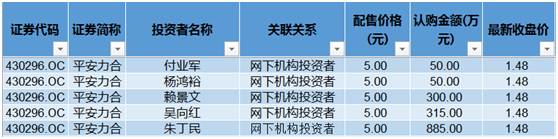 今年3月,5名自然人砸1600万元认购平安力合(430296)增发股份,目前浮亏达到70.4%。其中认购金额最大的朱丁民成了平安力合的第九大股东,从中报看仍未减持。
