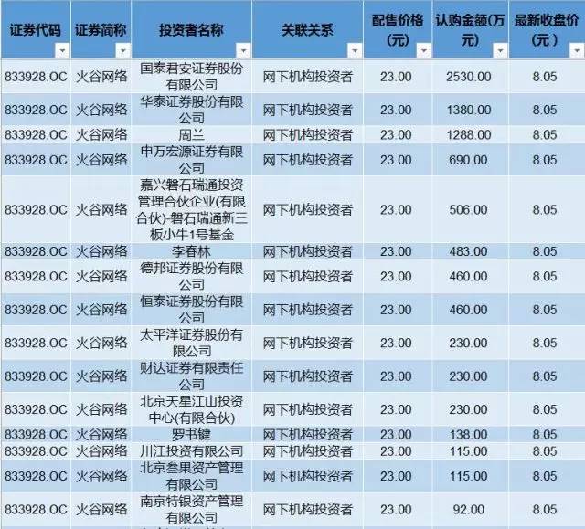 火谷网络(833928)1月份向15名投资者发行389万股,发行对象包括7家做市商、多家资管公司、新三板基金、自然人,还有天星资本旗下的北京天星江山投资中心。