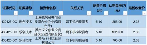 乐创技术(430425)今年2月发布股份发行方案,向三家企业发行400万股,发行价格5.10元/股。认购765万元的矩子科技是一家接受了IPO辅导、正在冲刺A股的公司。