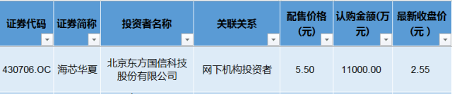 上市公司东方国信(300166)也很悲剧。东方国信去年12月决定战略入股海芯华夏(430706),以5.5元/股认购海芯华夏2000万股,发行完成之后东方国信成为挂牌公司第一大股东。