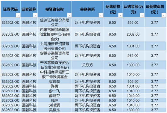 圆融科技(832502)今年1月向13位投资发行2043万股,发行对象包括券商、契约基金(中科招商深耕新三板二号)、投资企业以及多名自然人,发行价格6.50元/股。8月29日圆融科技收盘价3.77元/股,13名投资人浮亏69.65%。