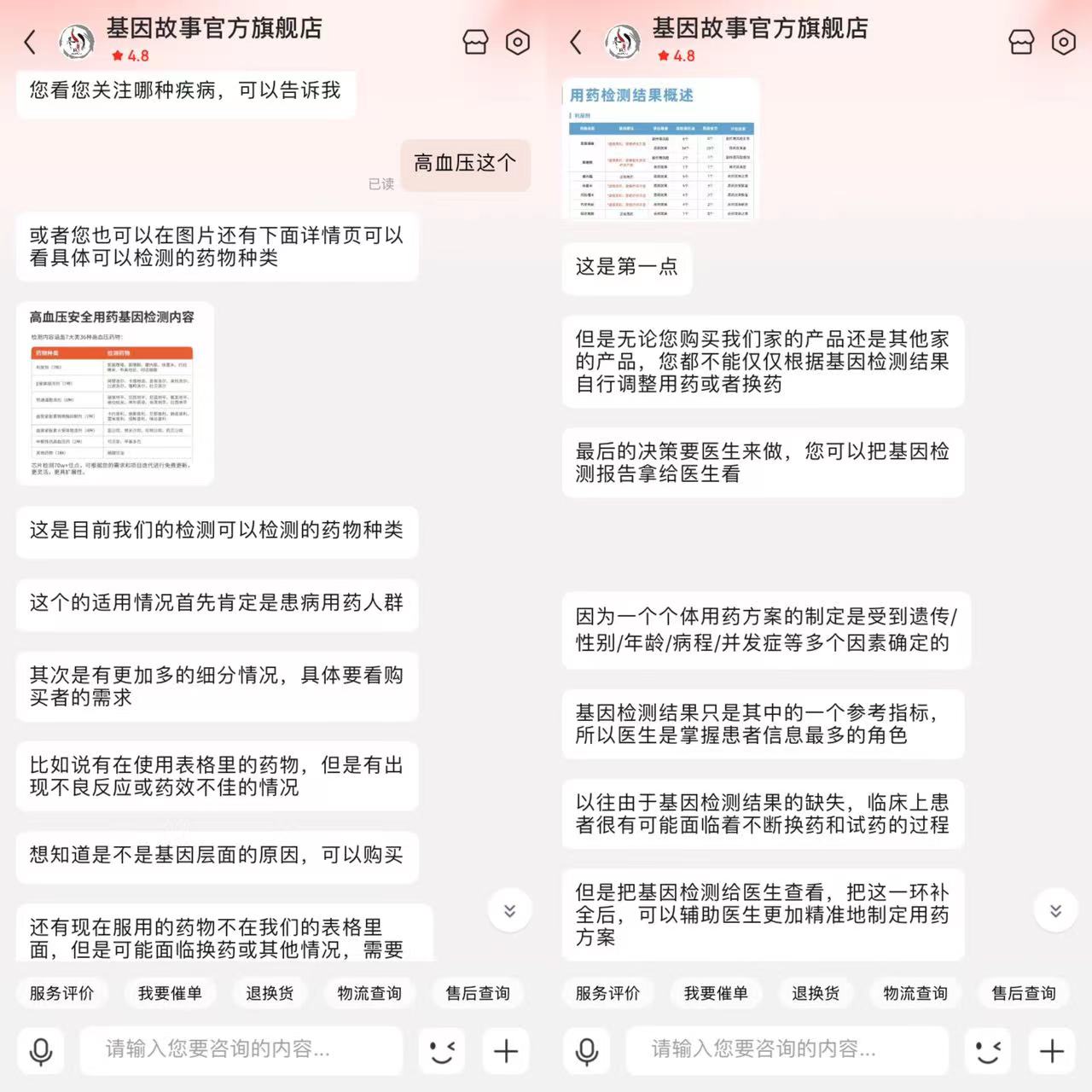 以高血压用药为例,该旗舰店客服人员介绍,这样的项目主要适合用药人群,尤其是用药过程中发现效果不佳,疑虑是否是基因问题的患者;或者是,想要换药时,需要提前评估用药优劣以及风险的人群,都可选择进行检测。简单来说就是,在不确定药是否有用的时候,都可检测。