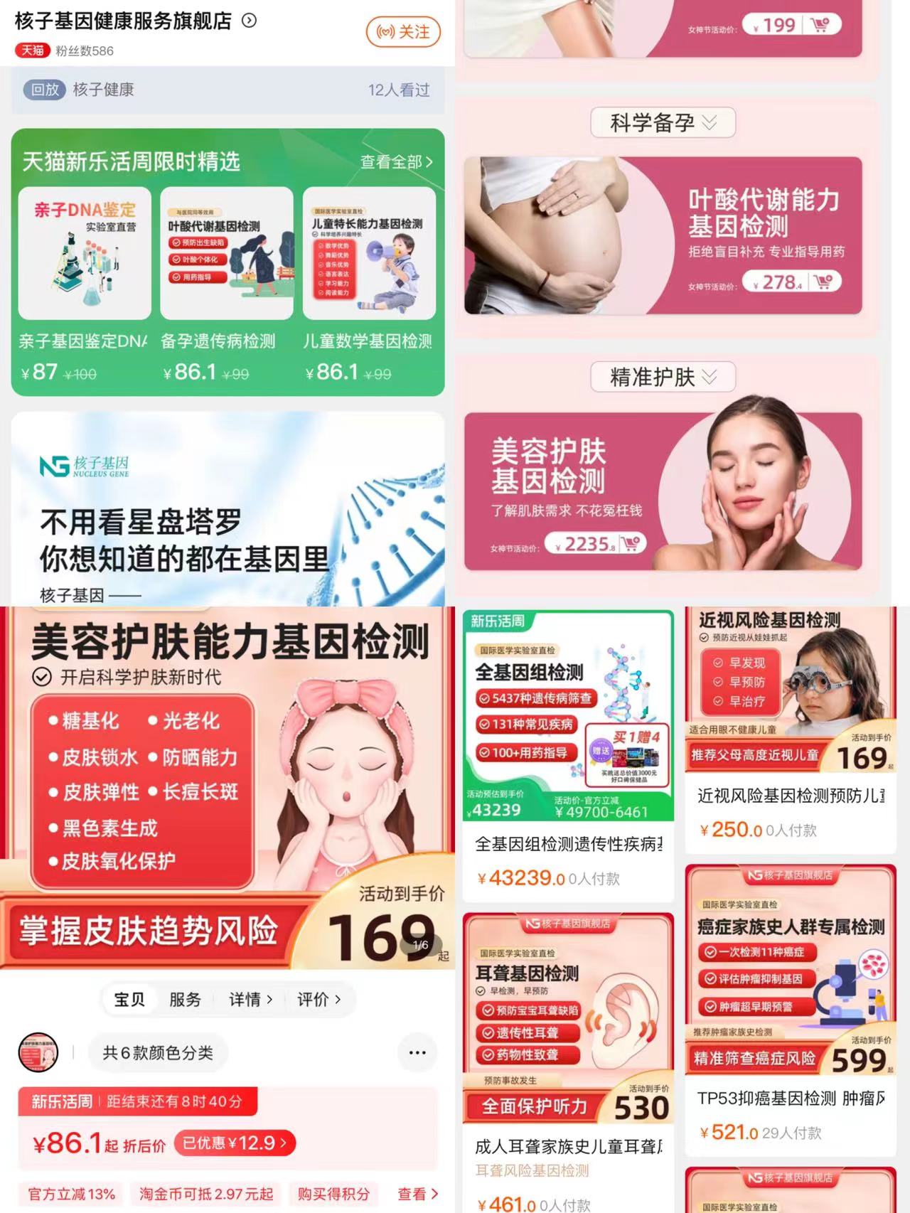 针对刚刚过去的“三八”节,该旗舰店推出的服务还包括美容护肤基因检测,海报上的价格为2235.8元。点击该页面后,细分的项目还包括:皮肤全套基因检测、皮肤水嫩基因检测、抗痘基因检测等等。