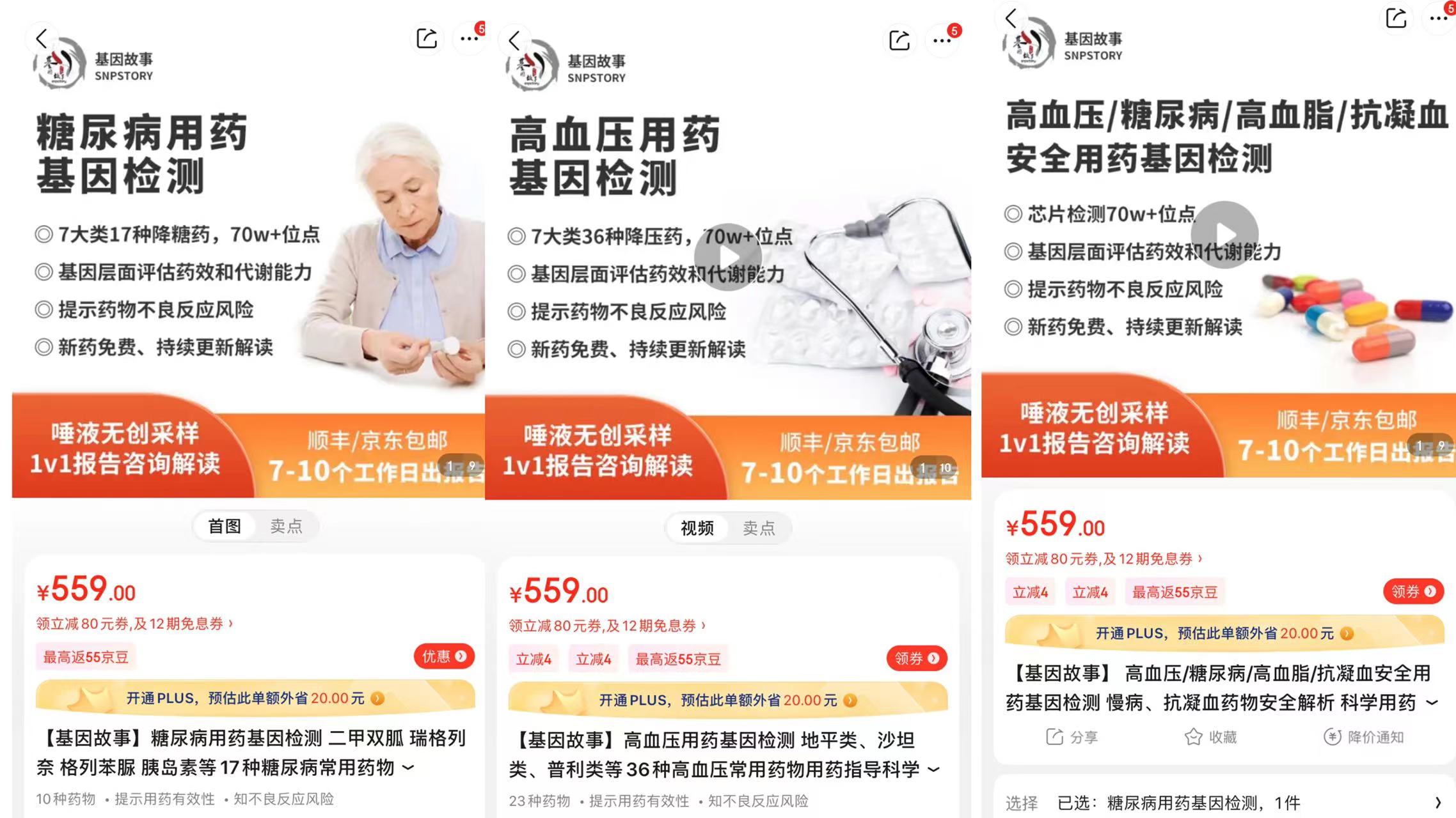 同样的,高血压用药的基因检测也同样能在这家旗舰店寻找到,地平类、沙坦类普利类药物均是潜在检测产品,售价同样是559元。此外,针对高血脂、抗凝血用药也同样可以在这家店检测。
