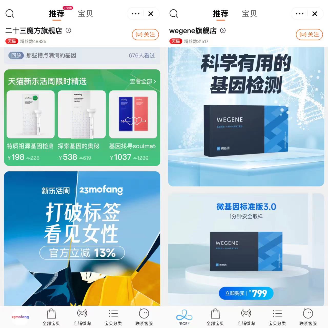而在微基因(We Gene)旗舰店中,其大多检测项目为“打包出售”,检测项目主要覆盖健康、运动、祖源、APOE检测(一项预测老年性痴呆、心脑血管疾病等的检测)等,价格由于项目较多而递增。