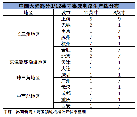 2019年以来,中国8英寸/12英寸集成电路生产线的数量和占比持续增加。从生产线分布来看,主要集中在以上海、江苏、浙江、安徽为代表的长三角地区,以深圳、广州为代表的珠三角地区,以北京、天津、大连为代表的京津冀环渤海地区,以武汉、成都、重庆、西安为代表的中西部地区。