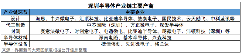 半导体产业链主要分为设计、制造、封装测试三个环节。深圳在芯片设计环节居于龙头地位,拥有包括华为海思、中兴微电子以及汇顶科技在内的众多明星公司,但在芯片制造、封装测试方面则缺乏竞争力。