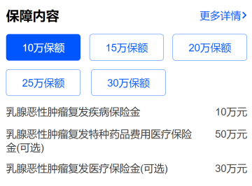 水滴乳爱保主险是给付型保障——乳腺癌恶性肿瘤复发疾病保障金最高30万元。在此基础上,该产品还提供“乳腺恶性肿瘤复发医疗保险金30万元和特药保险金50万元”作为可选项,投保人可根据自身需求和情况搭配投保。