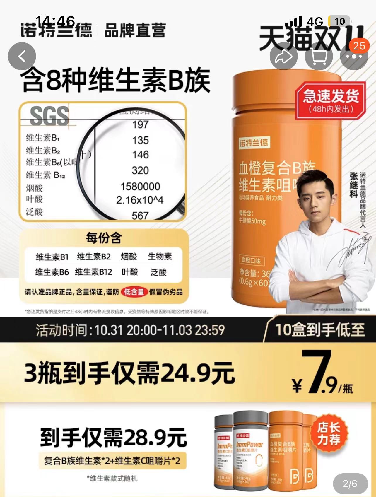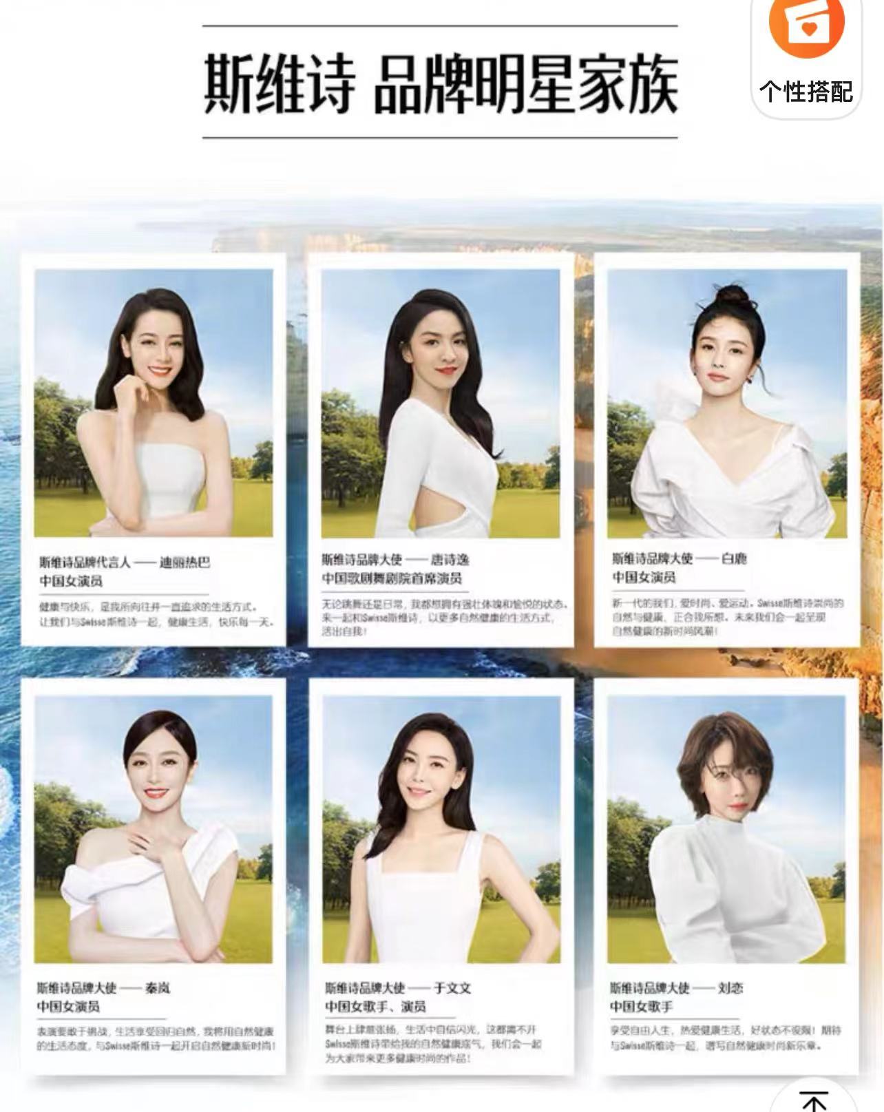 例如,澳大利亚保健品品牌Swisse斯维诗就请了不少中国当红明星代言。11月1日,界面新闻记者发现Swisse斯维诗淘宝海外旗舰店,存在有多位中国当红明星分别代言多款不同的Swisse斯维诗产品的情况,包括迪丽热巴、唐诗逸、白鹿、秦岚、于文文、刘恋。