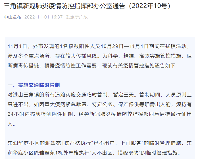 “中山发布”微信公众号援引三角镇新冠肺炎疫情防控指挥部办公室消息,11月1日,外市发现的1名核酸阳性人员10月29日-11月1日期间在三角镇活动,涉及多个重点场所,存在较大传播风险。为科学、精准、高效实施管控措施,阻断病毒传播链,根据疫情防控工作需要,现就有关疫情管控措施通告如下: