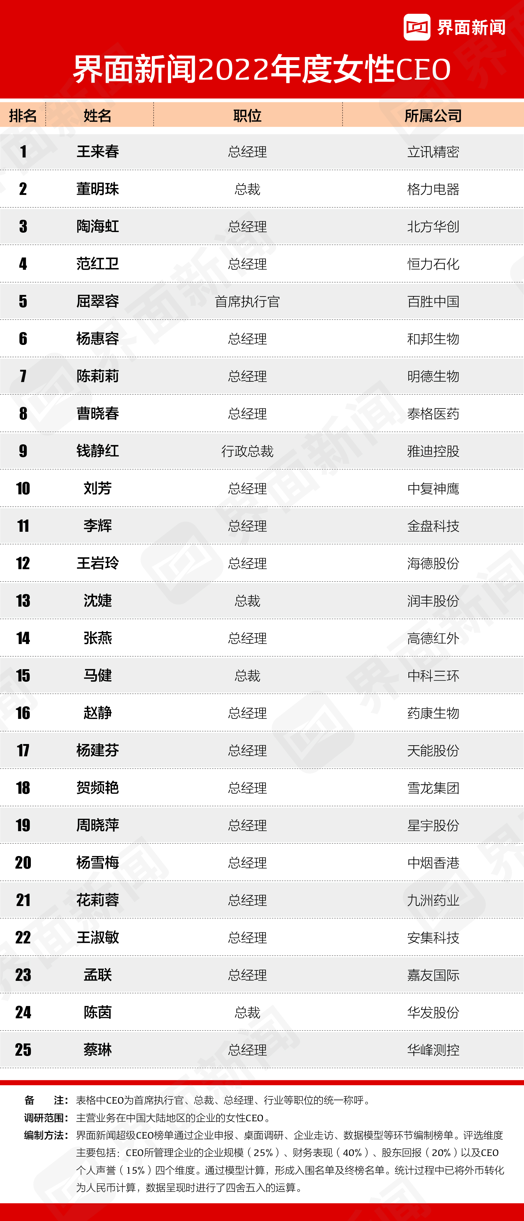 截至2022年9月底,在市值过百亿元(人民币,下同)的2068家上市公司中,有205家企业的在任CEO为女性,占比9.91%。女性CEO一直都是少数群体,虽然职业、职位、领导力都没有性别之分,但是要想挣脱社会的束缚和舆论压力就需要付出更多的努力。2022年界面新闻女性CEO榜单揭晓:从一个打工妹逆袭成千亿市值的立讯精密的掌门人王来春排在第一名,一路带领格力电器不断尝试多元化布局的董明珠排在第二名,北方华创的总经理陶海虹排在第三名。
