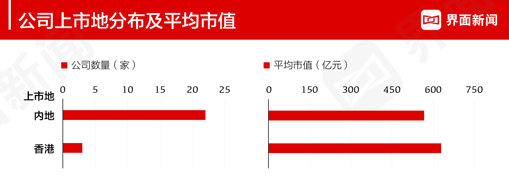 这25位CEO所在的公司,有22家在内地上市,3家在香港上市(多地上市的,按照A股、港股、海外股的次序选择)。从平均市值来看,A股市场及港股市场的平均市值分别为568亿元、630亿元。