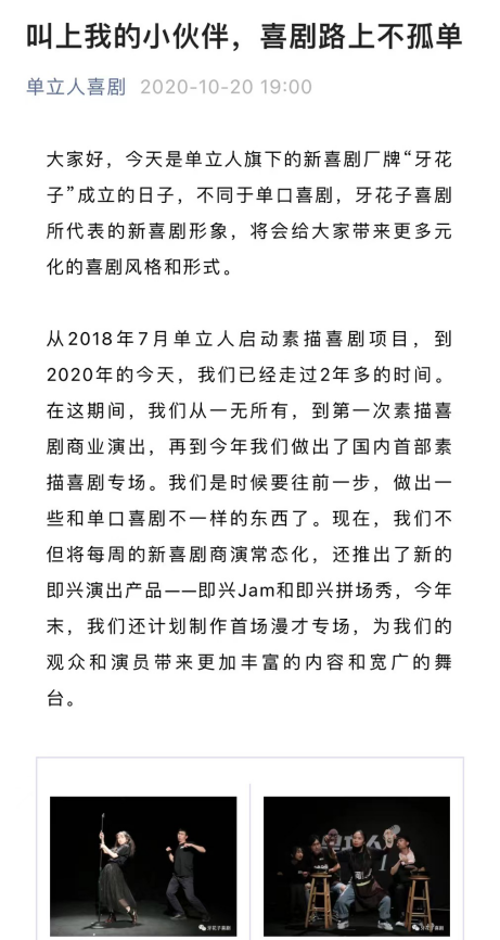 2020年,单立人推出喜剧厂牌“牙花子”