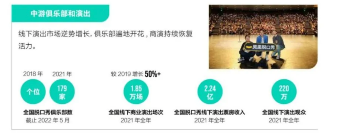 腾讯视频发布的《2022脱口秀营销白皮书》显示,2016年脱口秀演员还不到100人,2021年已经达到了万人。2021年全国线下演出观众达到220万人,票房收入2.24亿。