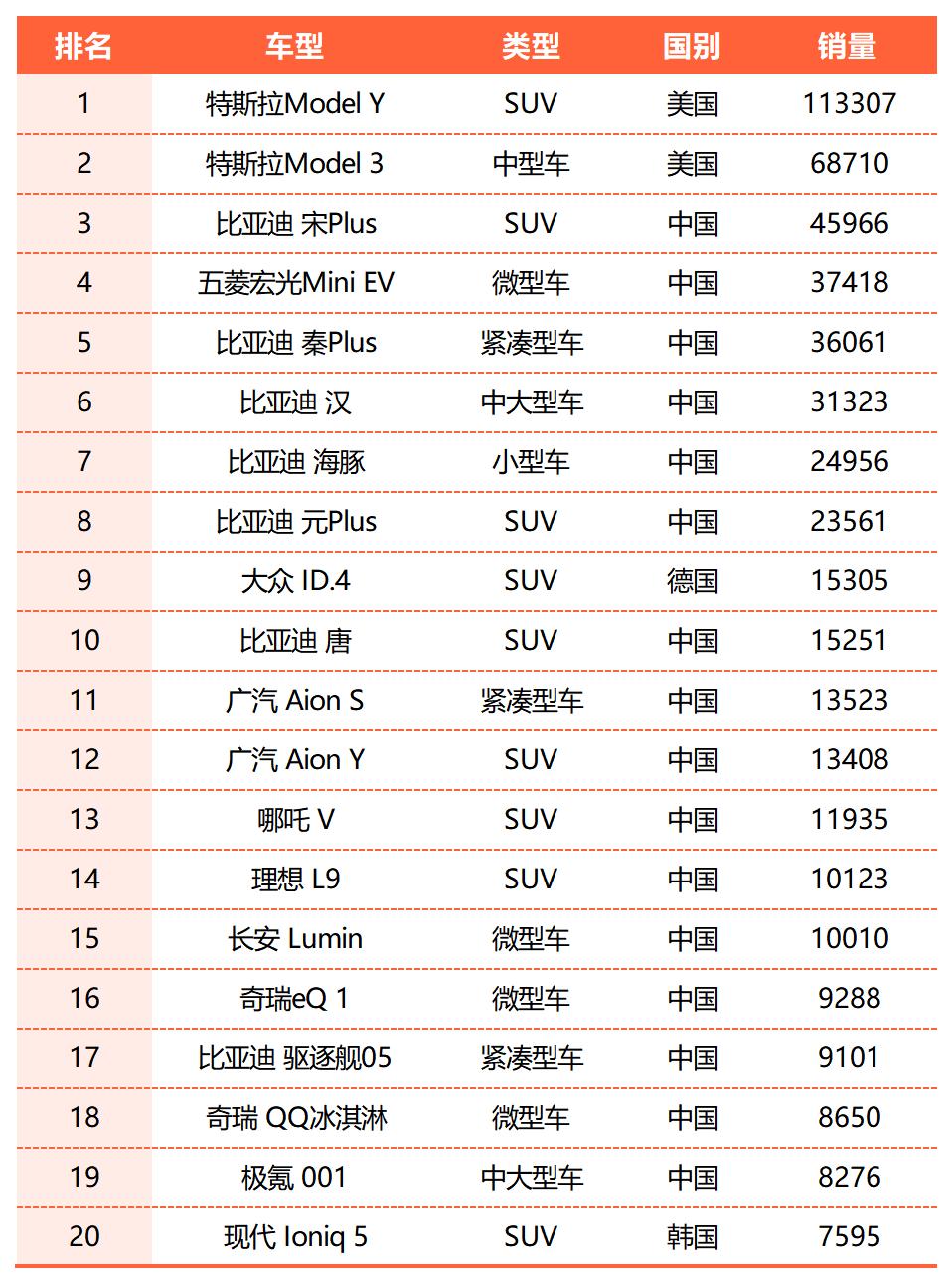 由于目前中国新能源车市场在全世界新能源车销量超过一半的事实,中国区新能源车销量前20几乎等同于全球前20。