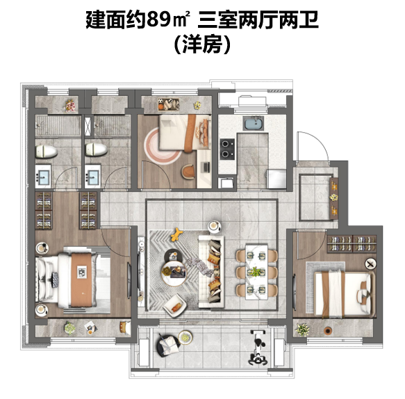 毕竟作为项目最后两栋洋房,央景楼王位置,绝版房源。建面约89㎡的洋房,三房设计,做到得房率约81%,4开间朝南、约11.2米超大南向面宽,横厅设计、飞机户型,全屋居然有5个飘窗,可谓板块的王炸户型了。