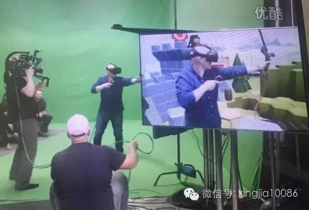 上面这个视频截图来源HTC Vive官方宣传片的Mixed Reality视频花絮,游戏画面来源于官方赠送的一款叫做"The Lab"的射箭体验游戏,而游戏者的画面是由一台摄像机配合第三只实体Vive手柄实时捕捉的。