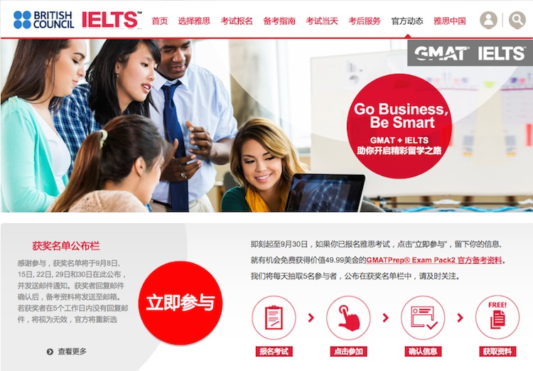 在雅思和GMAT的中文官网上均有此次活动的宣传页面,它们称这两个考试的组合是“申请商学院的明智之选”,主要因为在申请美、英、加、澳、港、法、新等主流国家和地区的商科及管理类研究生时,这会是“多国联申的最优选择”。