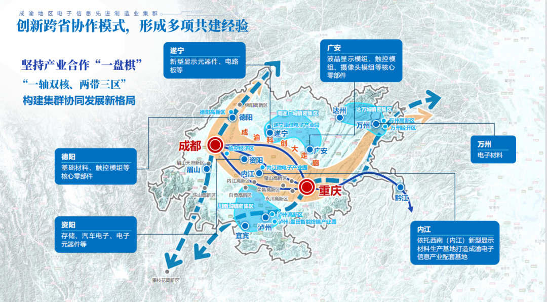 区域协作协同,确保国家战略落地落实。成渝从全局谋划一域、以一域服务全局,推动电子信息制造业成为区域产业体系中创新实力最强、产业基础最好、经济增长贡献最大的产业集群,已具备了打造全国首个跨省域先进制造业集群的基础和条件。