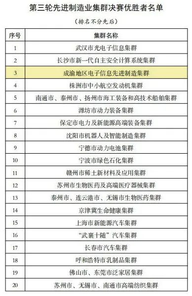11月2日,工业和信息化部《第三轮先进制造业集群决赛优胜者名单》公示期结束,全国共20个集群成为第三轮先进制造业集群决赛优胜者,其中成渝地区电子信息先进制造集群正式入围成为“国家级”先进制造业集群。