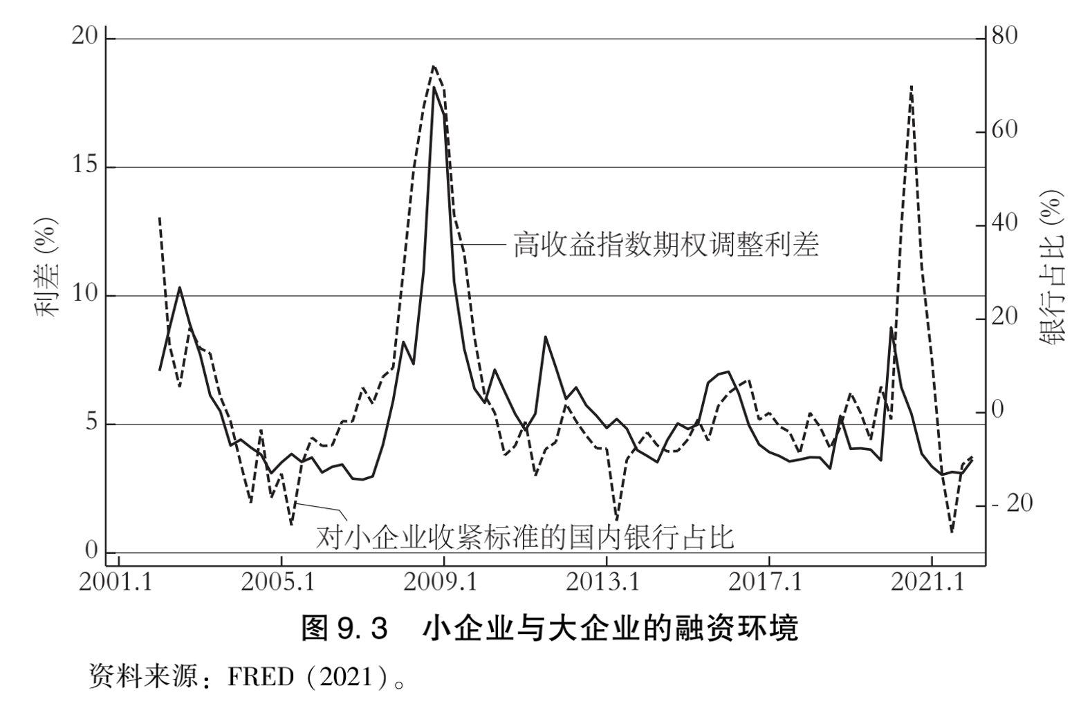 图9.3表明,大企业的信贷利差在2020年3月飙升,此后几乎回到疫情之前的水平。然而银行的贷款标准在疫情危机的最初阶段大幅收紧,这对小企业的外部融资成本关系重大。美联储对公司债券市场的干预稳定了债券利差,银行利润回升也使贷款标准得到放宽。于是,各产业之间的K形分化衰退特征尤其突出地反映在小企业与大企业面临的融资条件中。小企业(其中许多属于受创产业)发现自己受到双重束缚,既无法开展业务,又面临银行的高资金成本。下一章我们将介绍,美国的大企业从美联储公司债券购买计划中的获益远超过小企业。