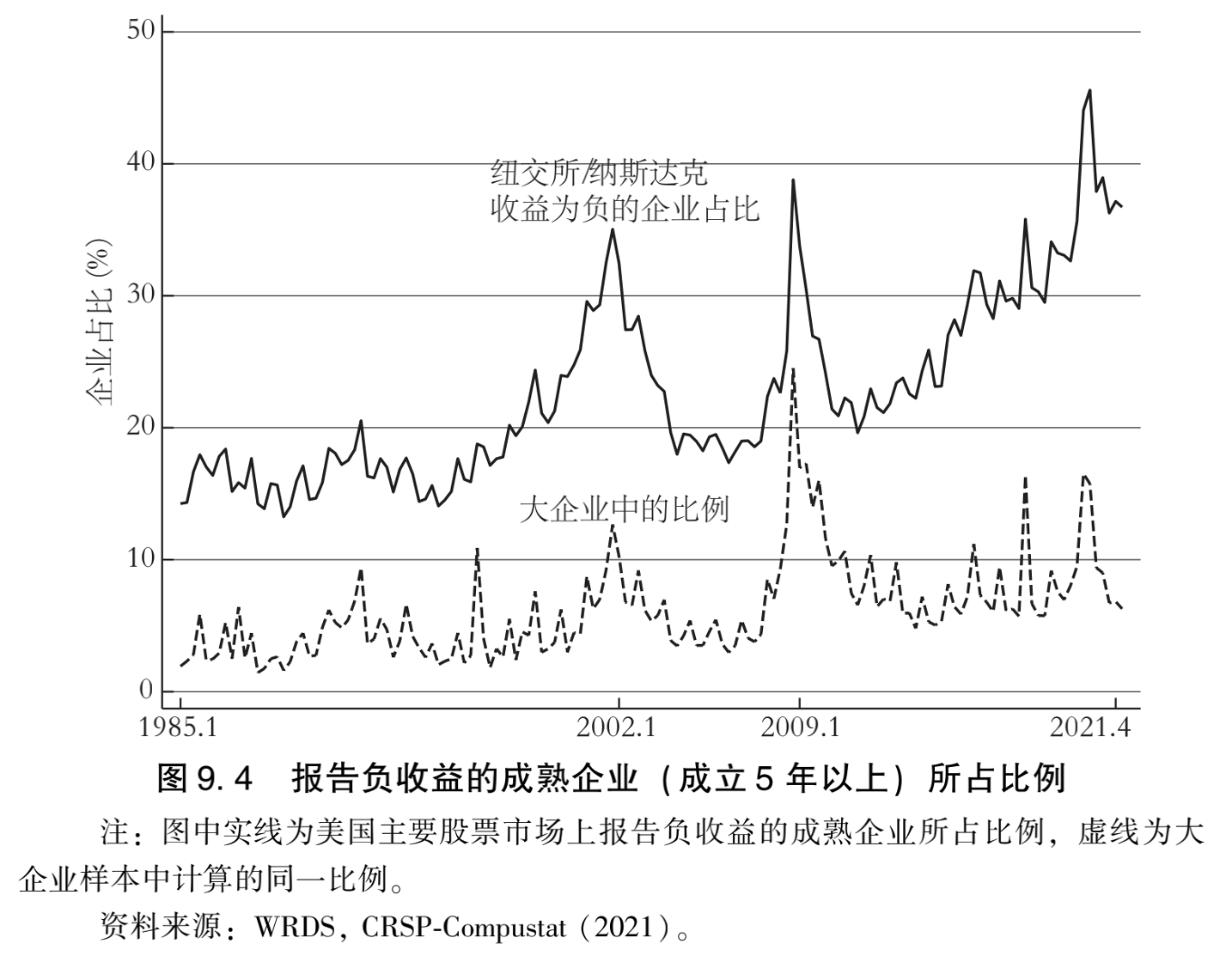 图9.4描述了每股收益(EPS)为负值的上市公司占比。鉴于许多初创企业在早年处于亏损状态,该图只包含成立5年以上的企业。可以看到,至少20%的美国成熟上市企业经常报告负收益,这部分是因为小企业的表现不佳,但每个季度也有约10%的大企业报告的每股收益为负值。另外,报告负收益的企业占比正在增加,特别是遭受会计损失的小企业。