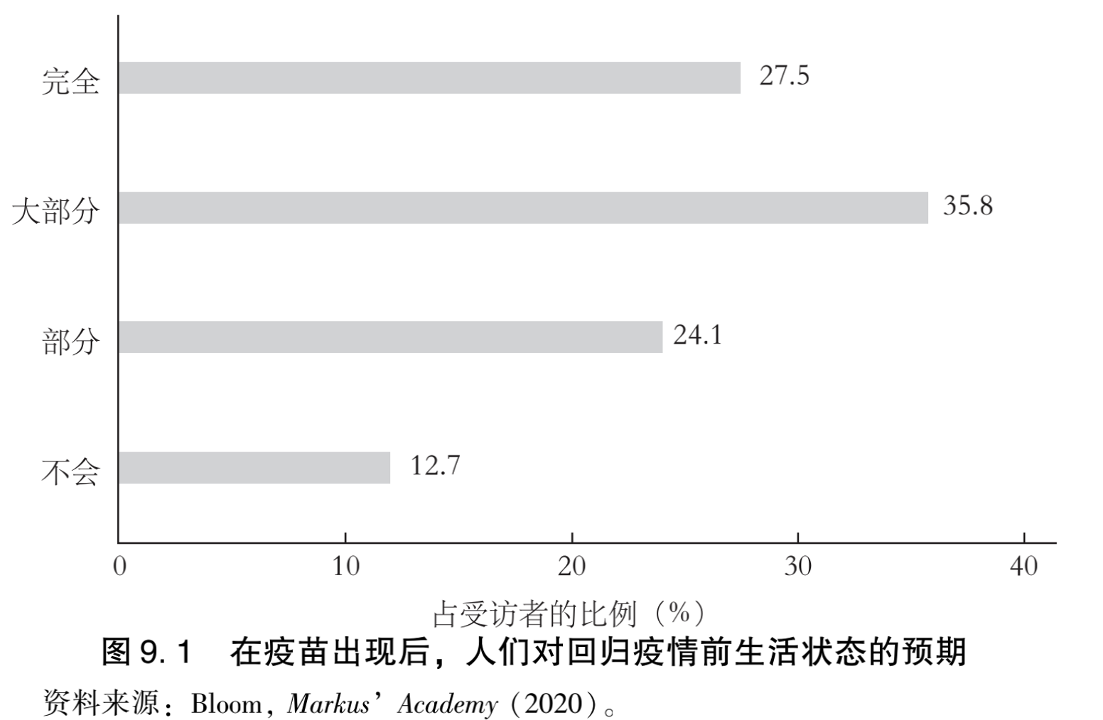 图9.1描述了长期疤痕效应在另一个维度的潜在影响:风险厌恶。调查要求受访者填充如下的句子:“在疫苗出现之后,我将在程度上恢复疫情前的生活状态。”仅有27.5%的受访者报告说将会完全恢复疫情前的生活。因此在接下来的好些年里,人们可能仍然会减少坐地铁、乘出租车、挤电梯或外出用餐,日常行为模式与若干经济部门将因之被重塑。
