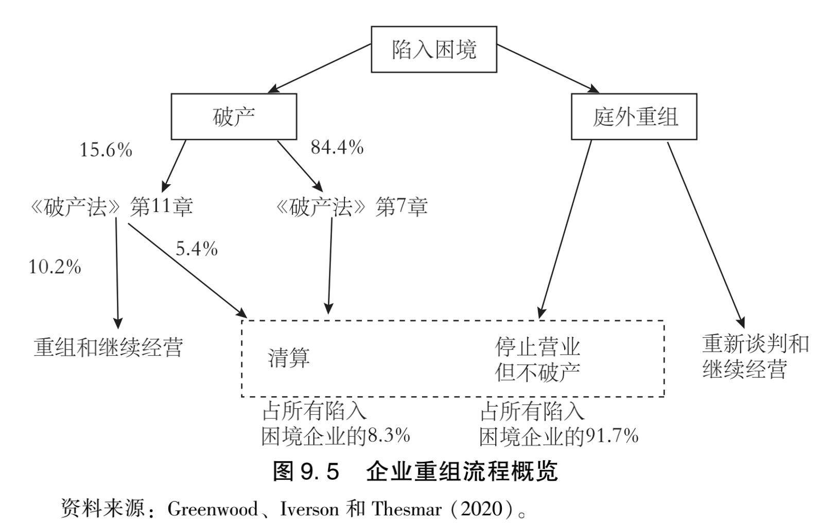 图9.5描述的是美国企业在财务困境中的通常出路。受困企业面临两种基本的结果:要么重组债务和业务,企业得以继续经营;要么破产清算。两种结果在程序上都可以通过破产法院系统,也可以通过私人谈判实现。法院可以作为与债权人谈判的一个强有力的外部威胁。